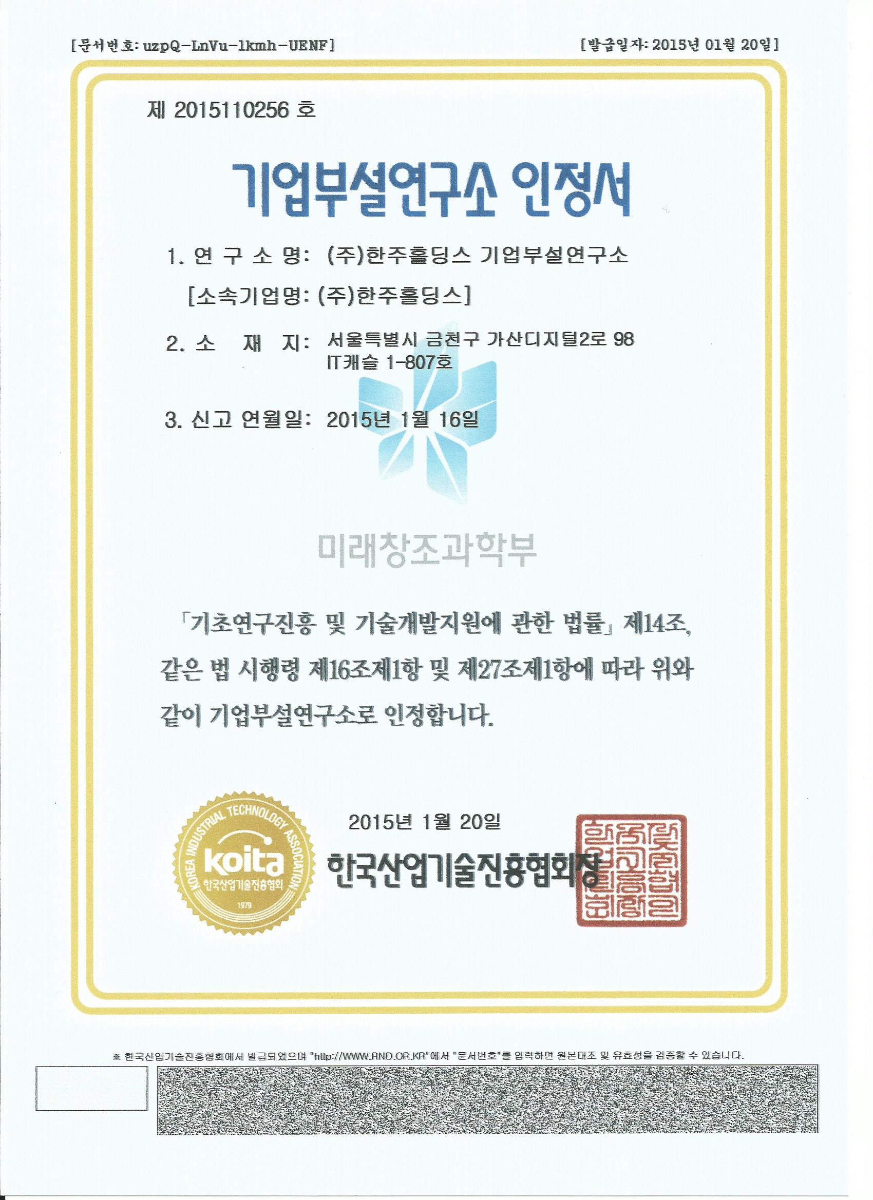 기업부설연구소 설립 ( 제 2015110256호 )